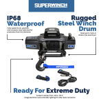 The SX10SR is engineered to provide users the ideal combination of power, speed, innovation, and proven performance they demand from Superwinch. Innovative features such as a patented drum light, relocatable die-cast aluminum control box, 3/8" diameter synthetic rope, a 12' lighted wired remote, and wireless handheld remote. SX Series winches exceed the most demanding standards of today's modern vehicles, while delivering an affordable and stylish design which incorporates many class leading features not found in other high-performance winches. Providing 10,000 lbs. of raw pulling power, the new SX10SR synthetic rope model has a sleek modern look and is built to last. With an IP68 rating for dustproof and waterproof operation, and a durable metallic graphite powder-coated finish this winch has it all.