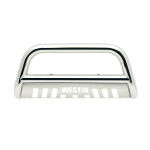 Westin(TM) E-Series Bull Bars are a front-end light bar designed for trucks and larger model SUVs. It is made of 3 diameter polished stainless steel tube. It mounts utilizing existing vehicle mounting points and installation does not require any drilling to the vehicle frame. Comes complete with mounting kit the Westin(TM) E-Series Bull Bar provides a mounting point for 2 auxiliary lights up to 6 in diameter. It features a die-cut Westin(TM) block logo design on the stainless steel skid plate unique to the Westin(TM) E-Series Bull Bar.